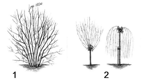 Okrasné převislé vrby, mandloně nebo růže, pěstované na kmínku, je třeba řezat pravidelně každý rok, aby si udržely hustý a kompaktní tvar koruny. Řez je důležitý hlavně u dřevin pěstovaných v nádobách, aby koruna příliš neztěžkla a kmínek se pod její váhou nezlomil. Dřeviny, které kvetou brzy na jaře, řežeme až po odkvětu koncem dubna (mandloň), ostatní dřeviny brzy na jaře (růže, vrby).