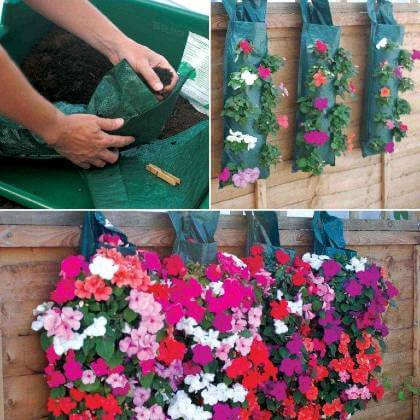 Pro snadnější manipulaci si tašku položte vodorovně na zem a tak vysazujte. Po vysazení zalijte jemnou růžicí pomocí konve. Takto můžete nechat tašku pár dní, dokud se rostliny nezakoření. Tuby vysazujte již zavěšené. Jelikož jsou otvory z obou stran, rostliny budou potřebovat volný prostor kolem. Nezapomeňte do vody přidávat hnojivo pro bohaté kvetení, které rostliny stejně potřebují stejně, jako i ty pěstované v nádobách a truhlících. Doporučujeme hnojivo Kristalon „Plod a květ“.
