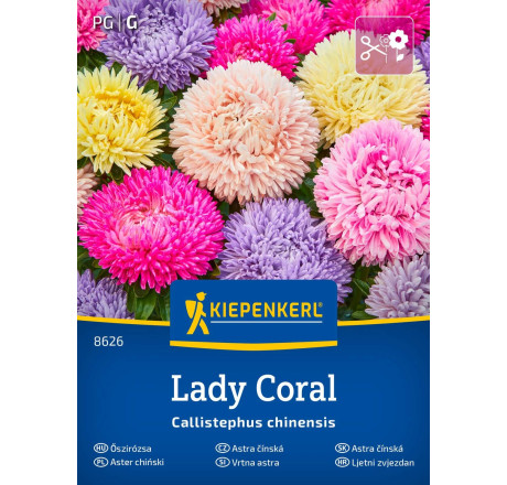 'Lady Coral' je směs různých barev (lososová, růžová, fialová, bílá a žlutá) jednoletých rostlin s krásnými, plnými květy (průměr 8-12cm), dorůstajícími do výšky 24-36cm. Stonky jsou vzpřímené a tvrdé, ve spodní části hustě zarostlé listy, které nezakrývají květiny. Krásně vypadají na záhonech, z...