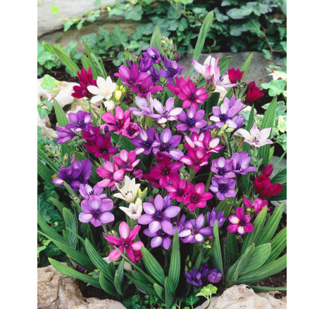 Novinka! Babiana stricta a mix zajímavých rostlin. Směs modrých, fialových, růžových cibulek. Často jsou označovány jako australské frézie. Pochází z Afriky. Výška 20-25 cm. Na zimu se vybírá z půdy, naše zimy nepřežijí.
