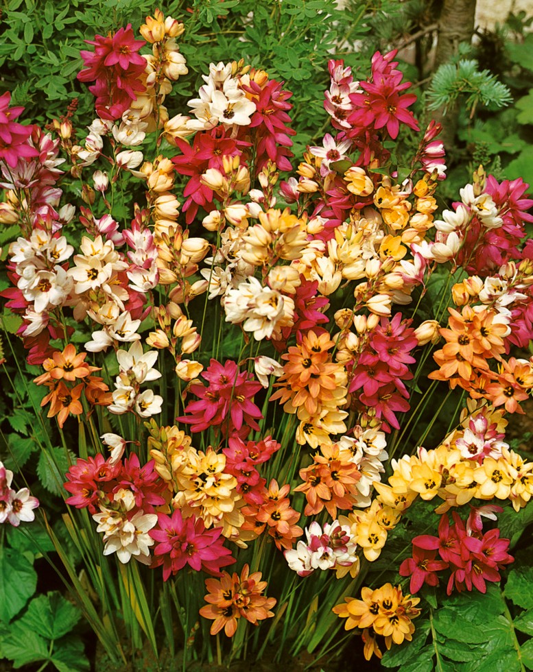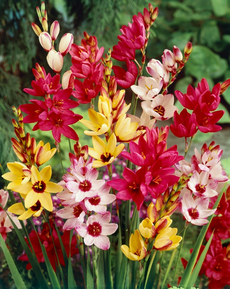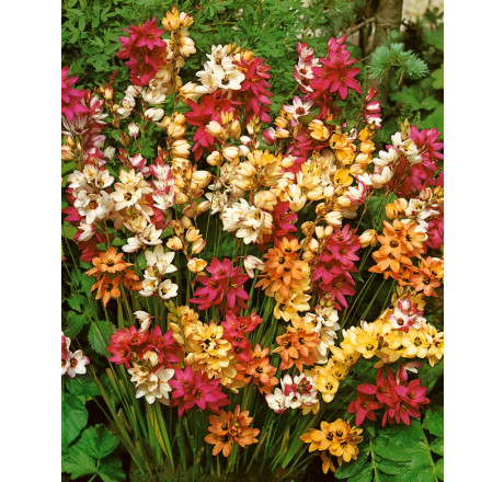 Zajímavá hlíznatá cibulovina vzdáleně příbuzná oblíbeným mečíkům. Na stonkách rozkvétají klasovitá soukvětí pestrých barev. Výška 40 cm.*** PARAMETRY *** Barva květu - vícebarevná; Výška - 35 cm
