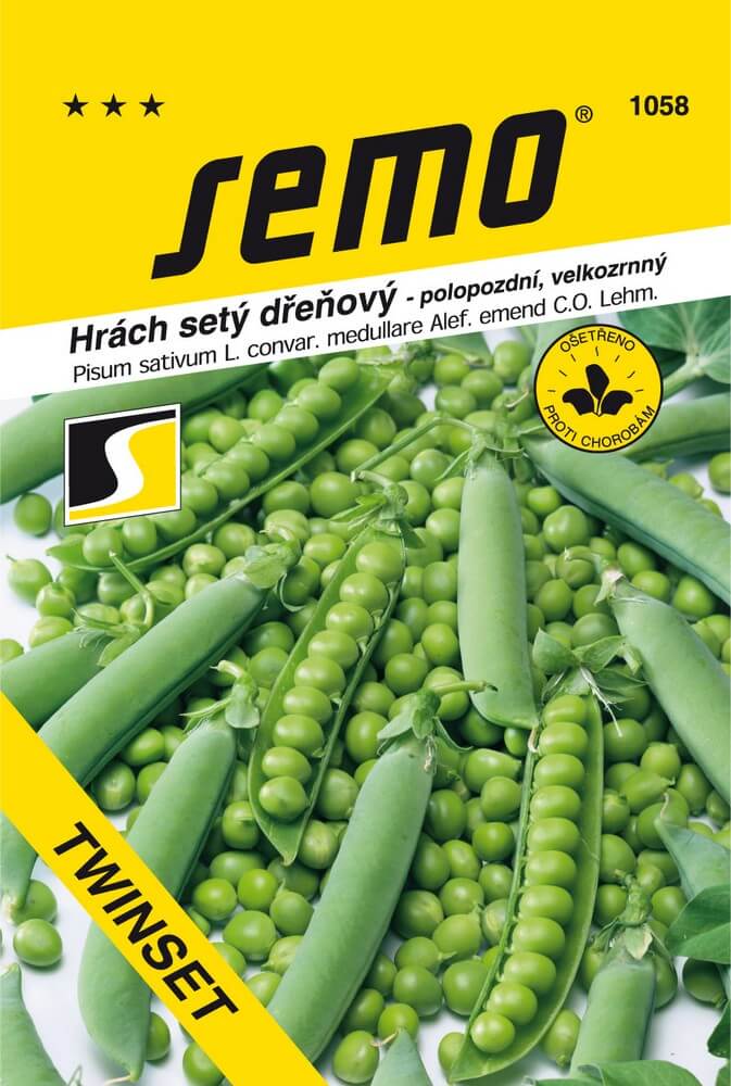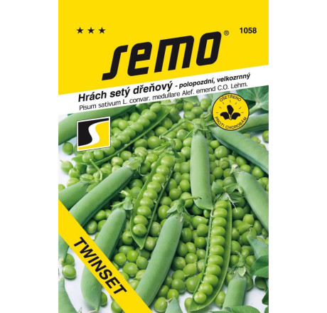 Středně pozdní odrůda s větším zrnem a delším, tupým luskem. Díky dlouhému a rovnému lusku (cca 9 cm) je TWINSET ideální odrůdou pro ruční i kombajnovou sklizeň. Je rezistentní k padlí i k fusáriovému vadnutí a dosahuje špičkových výnosů. TWINSET je první odrůdou v sortimentu SEMO rezistentní k viru PSbMV (Pea Seed-borne Mosaic Virus).