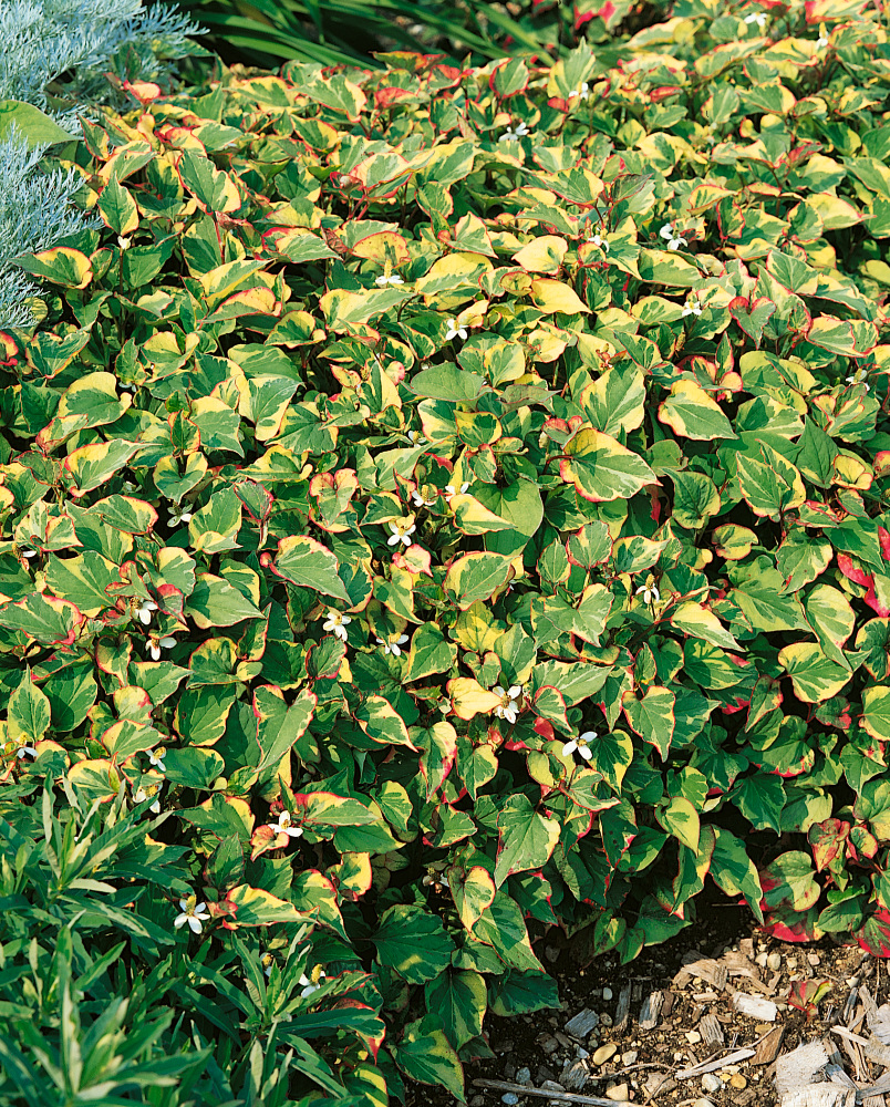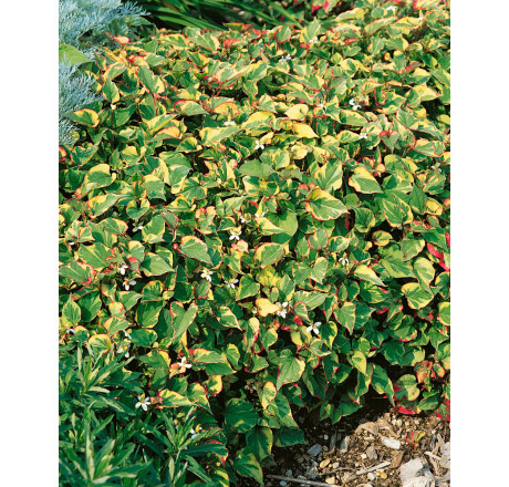 Miniaturní trvalka se srdčitými panašovanými listy zelené barvy s krémově žlutými okraji. Listy v průběhu roku mění barvu v závislosti na slunečním svitu. Květy jsou nenápadné, bílé barvy.***PARAMETRY***Kvetení - 7 , 8; Výška - do 30 cm; Odolnost - citlivá na mráz vyžadující zimní přikrývku ; Světlo - slunce až polostín ; Zálivka - střední ; Půda - středně těžké , písčitohlinité , hlinité_rašelinové a kyselé půdy ; Vlhkost půdy - vlhká ; Barva listu - vícebarevné , pestrolisté , panašované ; Barva květu - bílá ; Rychlost růstu - středně rychlý ; Umístění - pôdopokyvné_ skupinová výsadba_květináče_okraj záhonov_výsadba pod stromy