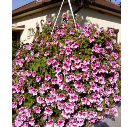 Miniaturní převislá forma anglického muškátu. Má drobné listy i květy. Horní okvětní lístky jsou růžové, dolní celobílé. V závěsném květináči vytvoří skutečnou barevnou kouli. Kvete velmi bohatě v průběhu celé vegetace. Prospívá mu sluneční místo i polostín. Výborně se hodí do žardiniér i do okenních truhlíků. Pravidelné odstraňování odkvetlých květenství prodlouží jeho kvetení. Dá se přezimovat, mnozí ho však pěstují jako letničku. ***PARAMETRY*** Světlo - slunce, polostín; Půda - středně těžká, písečnatohlinitá, hlinitá; Umístění - květináče; Odolnost - zazimování v chladné a světlé místnosti; Řez - každoroční řez po odkvětu; Zálivka - střední; Vlhkost půdy - středně vlhká; Barva listu - zelená; barva květu - růžová_biela; Kvetení - 5,6,7,8,9,10; Speciální vlastnosti - přitahuje motýli a včely_dlhé kvetení; Výška - do 30 cm; Forma - převislá; Rychlost růstu - středně rychlý; Opadavost - stálezelená rostlina; Šířka - do 30 cm