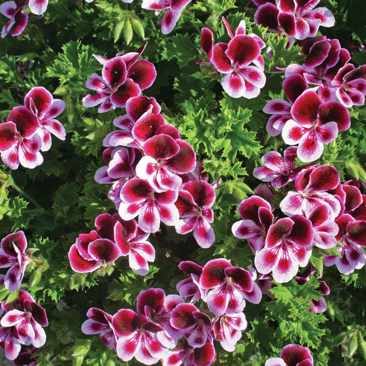 Květiny vínově červené barvy s bílým okrajem, neustále kvete, jednoduché, vzrůst střední, vzpřímený, citrónová vůně listů, kvést začíná brzy. Třeba zaštipávať.