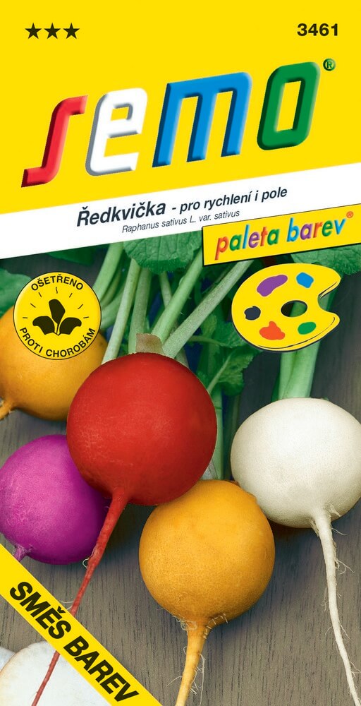 Směs barevných odrůd vhodných pro rychlení, jarní a podzimní pěstování na poli. Osivo jednotlivých odrůd je v sáčku barevně odlišeno mořením.