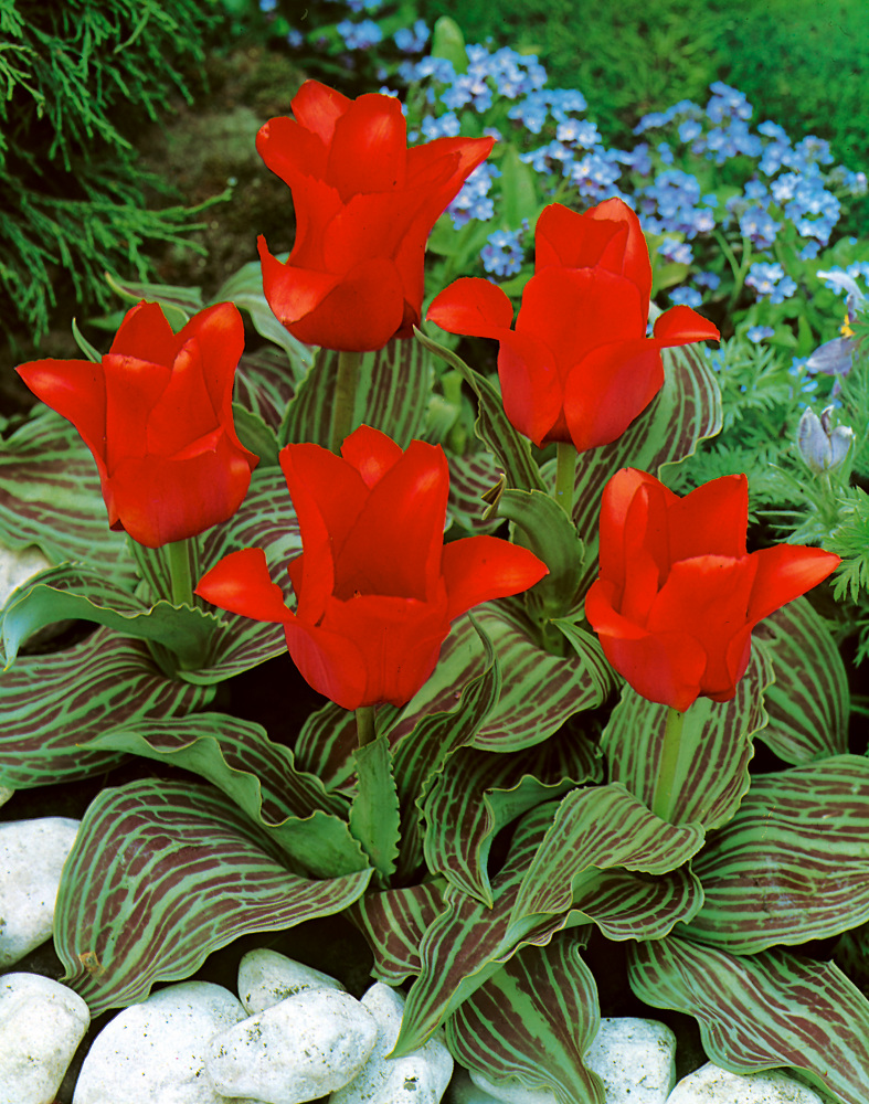 Zářivě červený tulipán s velmi příjemným názvem vynikne nejlépe, když je vysazený ve skupinkách na pozadí nižších skalkových rostlin. K atraktivitě přispívá i fialová kresba na listech. Výška 20 cm.