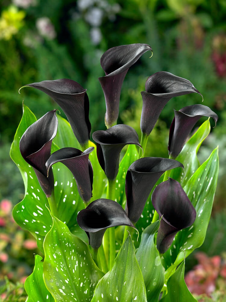 Novinka mezi kalami. Kornoutice ´Odessa´ Vás okouzlí svou zajímavou tmavě fialovou až černou barvou. Dosahuje výšky 60 cm. Kvete podle termínu výsadby od VI-IX.